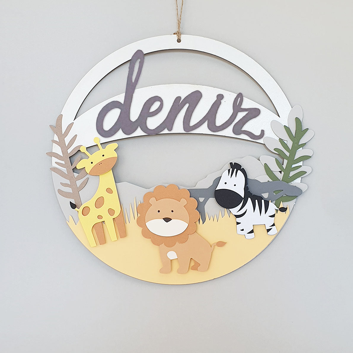 Çelenk içeriği: Arslan, zebra, zürafa ve Afrika manzarası.
