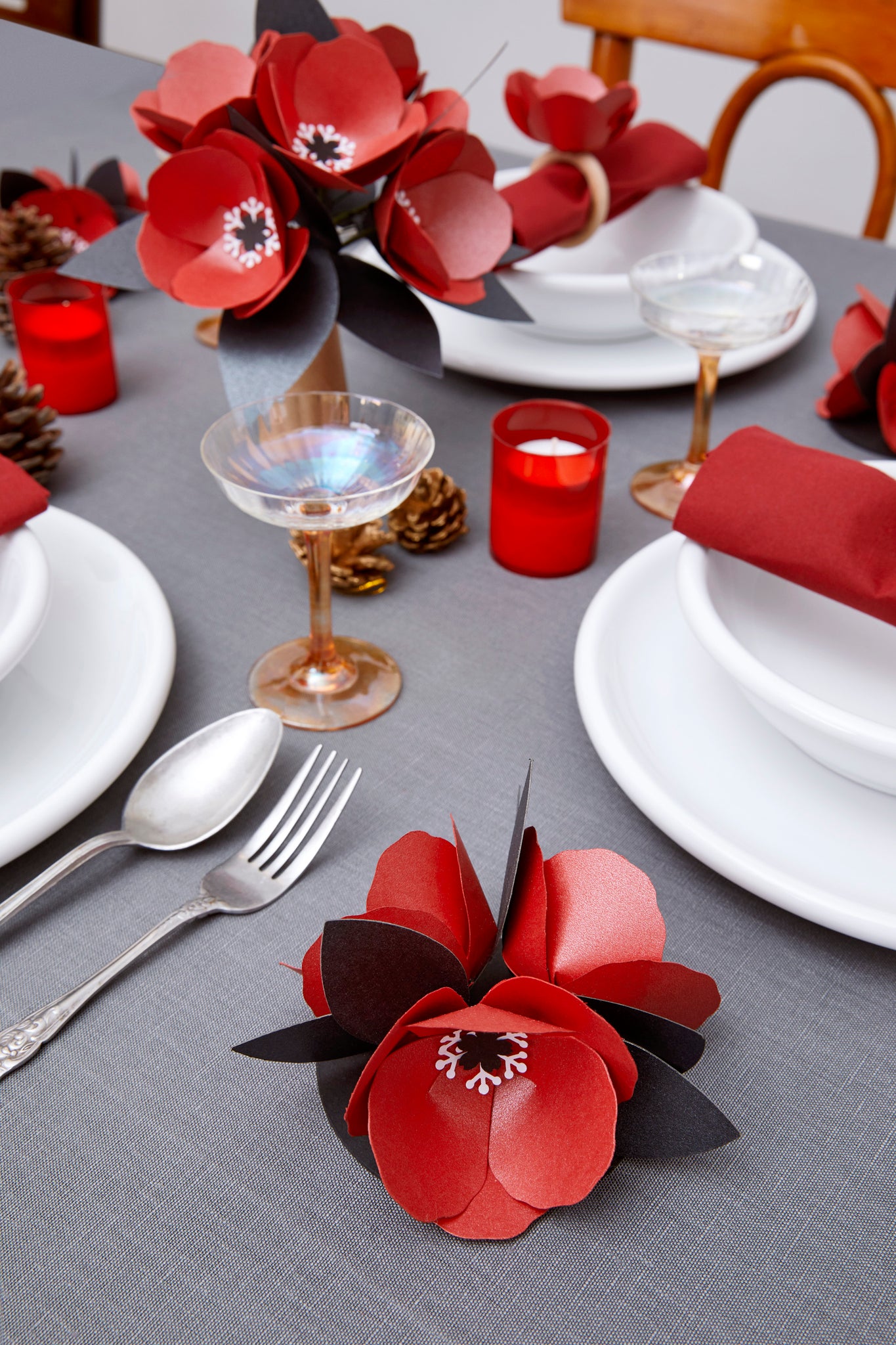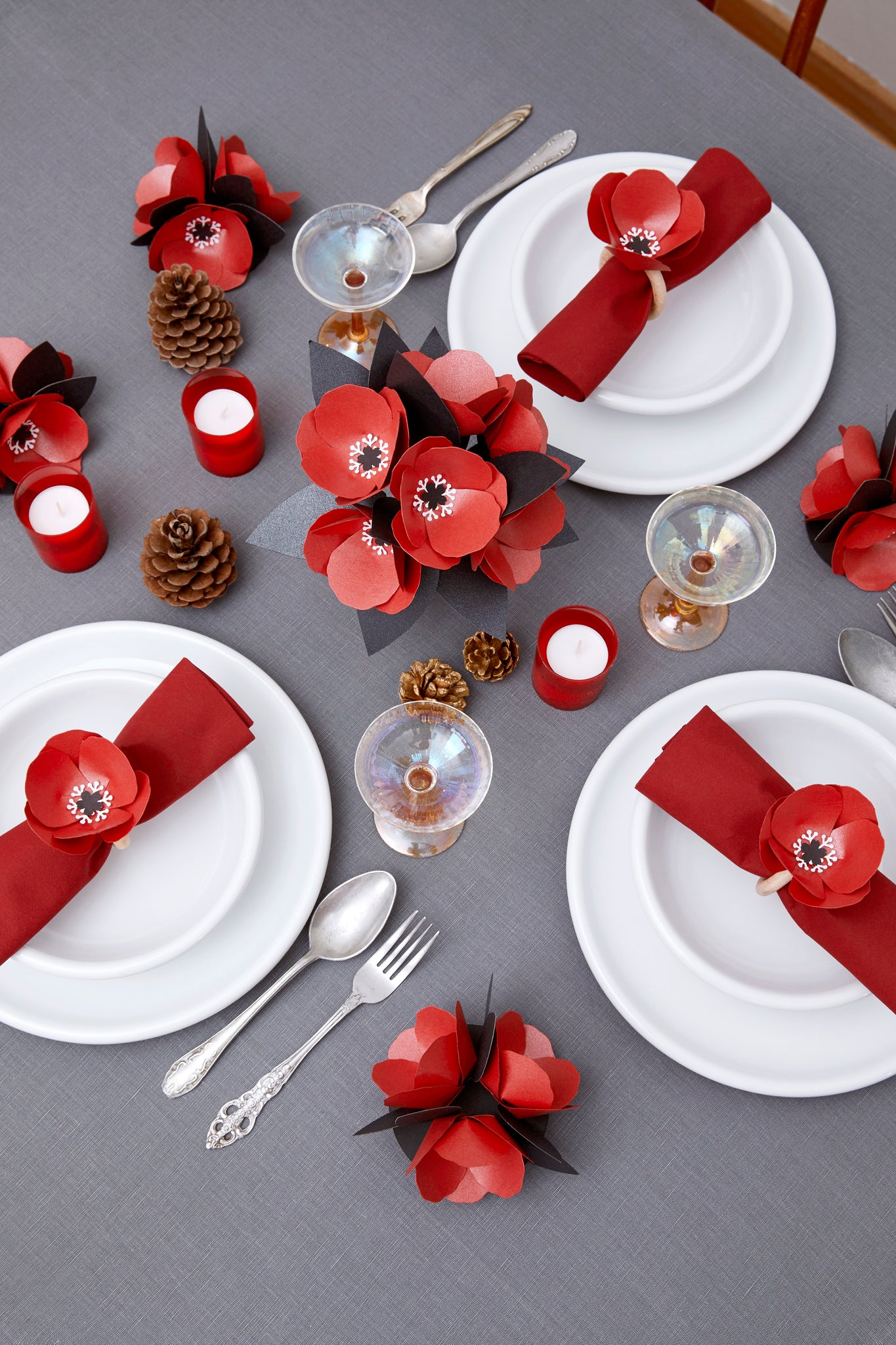 Kağıt Çiçek Sofra Aranjmanı İçeriği: Kırmızı simli anemon, dusty miller.