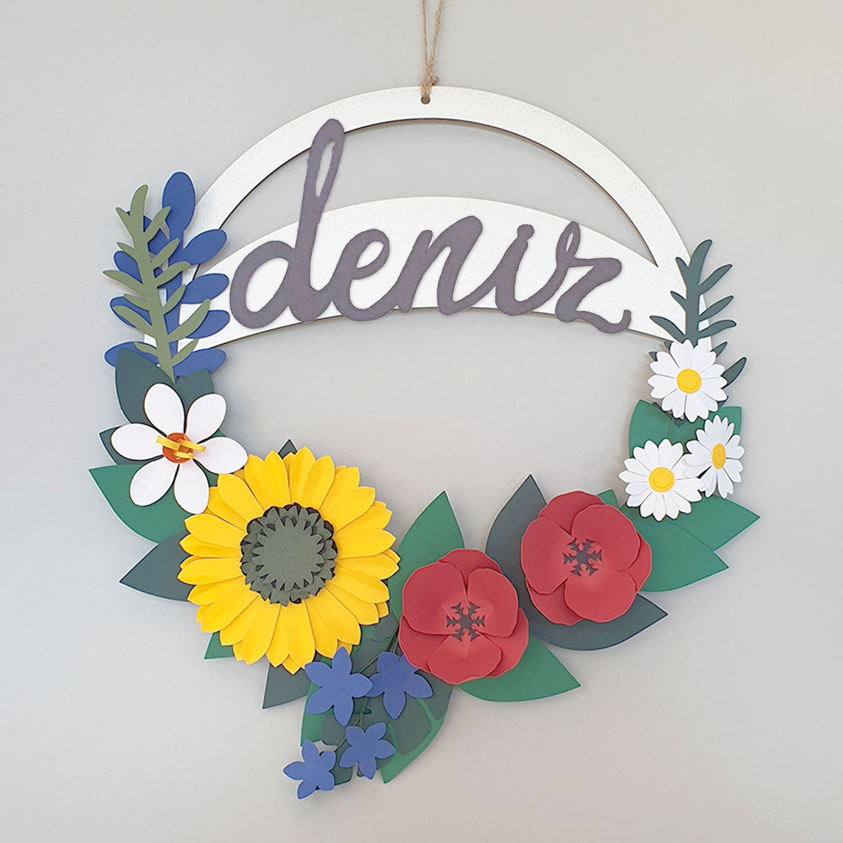 Çelenk içeriği: Ayçiçeği, gelincik, nergis, sümbül, kır çiçekleri ve yeşillikler.