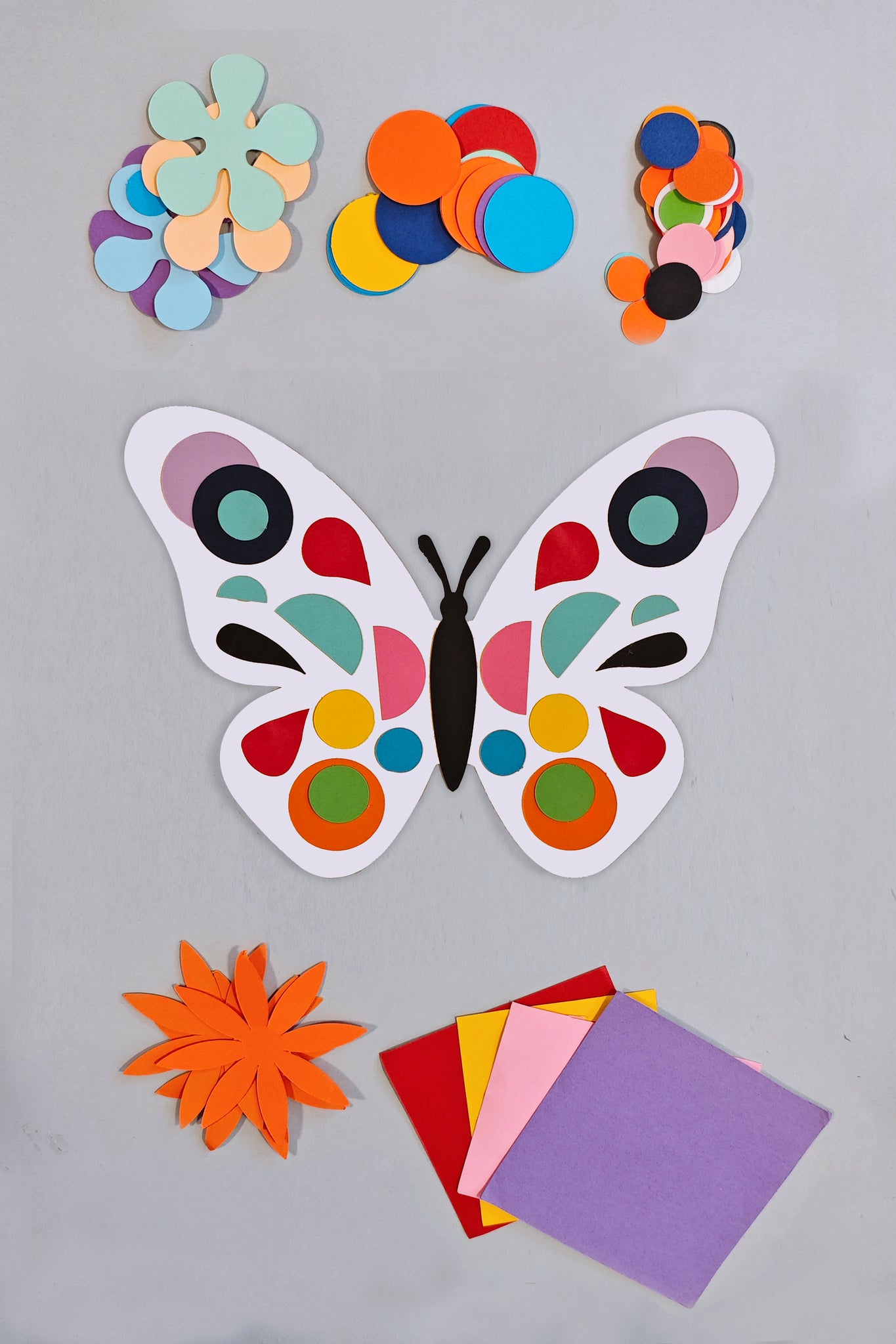 Kelebek altlığına karton parçalarıyla renk katın.